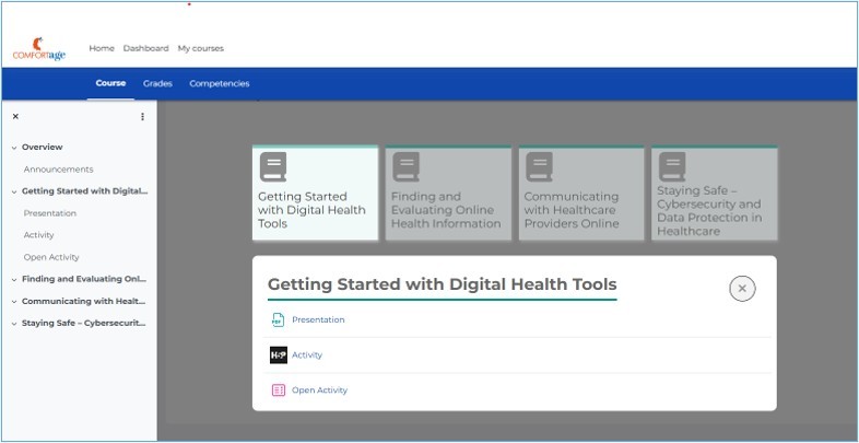 The delivery of the curriculum is supported by two digital platforms: the Training and Educational Toolkit (TET) and the Training and Educational Marketplace (TEM). TET provides a modular and accessible learning environment featuring thematic content, real-world scenarios, visual resources, and interactive self-assessment exercises that promote self-paced learning and confidence in using digital health solutions. TEM complements this with a curated catalogue of digital health applications, enabling users to discover relevant tools, review community evaluations, and apply practical solutions to support prevention, self-care, and caregiver–patient communication.